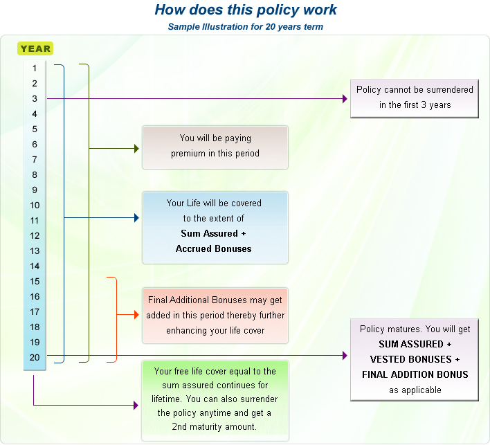 • LIFE COVER: Sum Assured + Bonus + Final Addition Bonus (as applicable) during the predecided term. After that life cover is equal to the sum assured for the rest of life