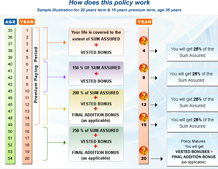 Survival benefits are payable at regularintervals (see table below). Full sum assured is paid back by the end of the premium paying period.