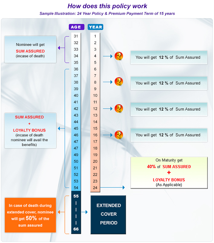 • Offering savings and protection, this plan features guaranteed payout after every fourth year along with extended risk cover facility at no extra cost